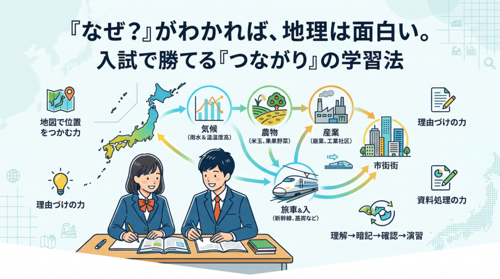 地理は「暗記が多い科目」に見えますが、入試で点が取れるかどうかは、暗記量よりもつながり(位置→地形→気候→産業→都市・課題)を説明できるかで決まります。用語を一問一答で覚えても、設問が「理由」「比較」「資料読み取り」になるとつまずくのは、なぜそうなるかが頭の中で結びついていないからです。