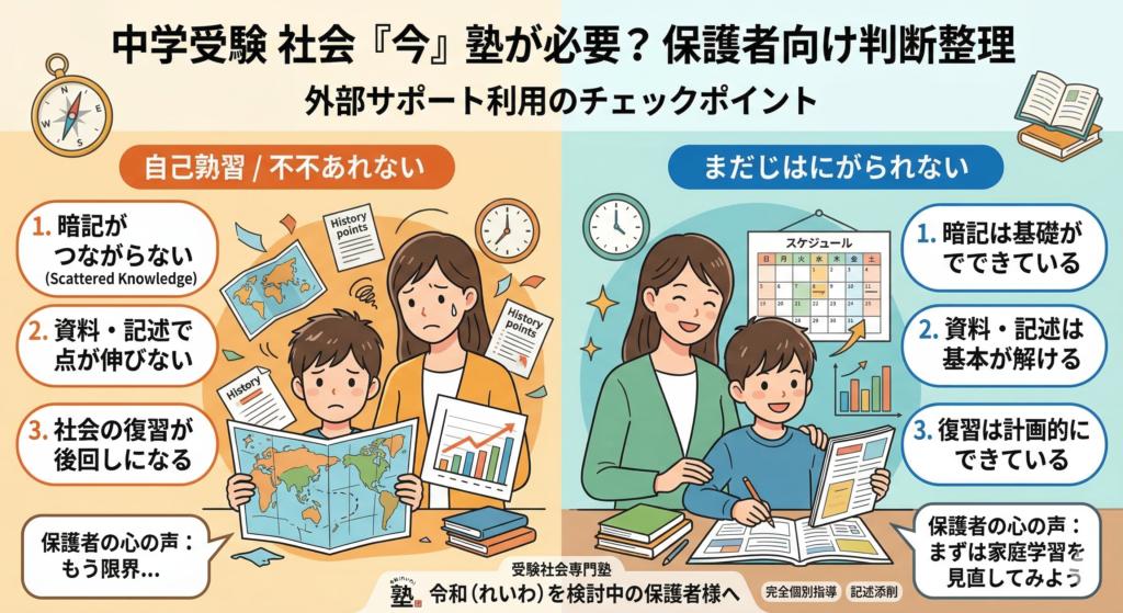 ここで整理したいのは三つです。ひとつは、まだ外部の力が要らない可能性が高い状態です。もうひとつは、社会の復習や得点化が家庭学習だけでは修正しにくくなっている具体的なサインです。最後に、受験社会専門塾 令和のような社会特化の個別指導が合いやすいご家庭と、そうでないご家庭の違いです。